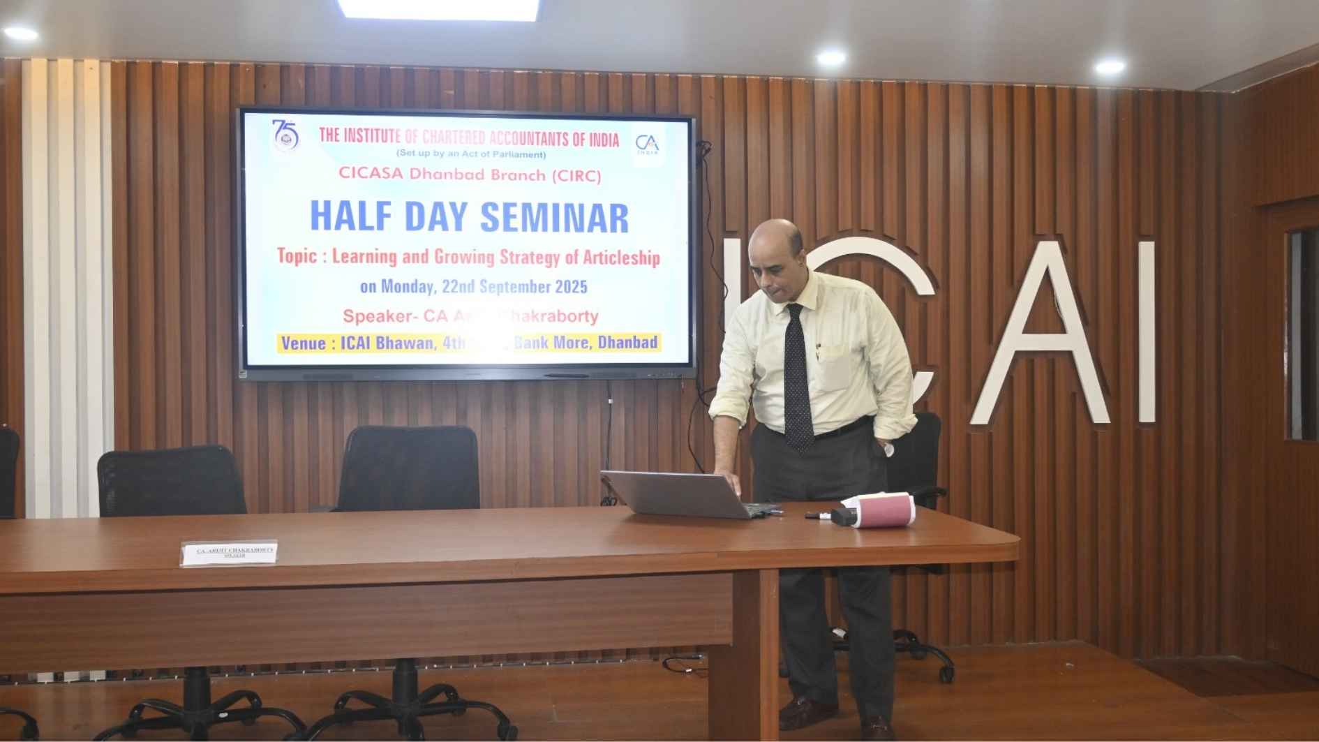 धनबाद, 22 सितम्बर 2025: इंस्टिट्यूट ऑफ चार्टर्ड अकाउंटेंट्स ऑफ इंडिया (ICAI) के स्टूडेंट स्किल्स एनरिचमेंट बोर्ड (बोर्ड ऑफ स्टडीज़) के सौजन्य से तथा सीआईसीएएसए धनबाद (CIRC) के तत्वावधान में आज “लर्निंग एंड ग्रोइंग स्ट्रैटेजी ऑफ आर्टिकलशिप” विषय पर एक अर्ध-दिवसीय सेमिनार का आयोजन आईसीएआई भवन, बैंक मोड़, धनबाद में किया गया।