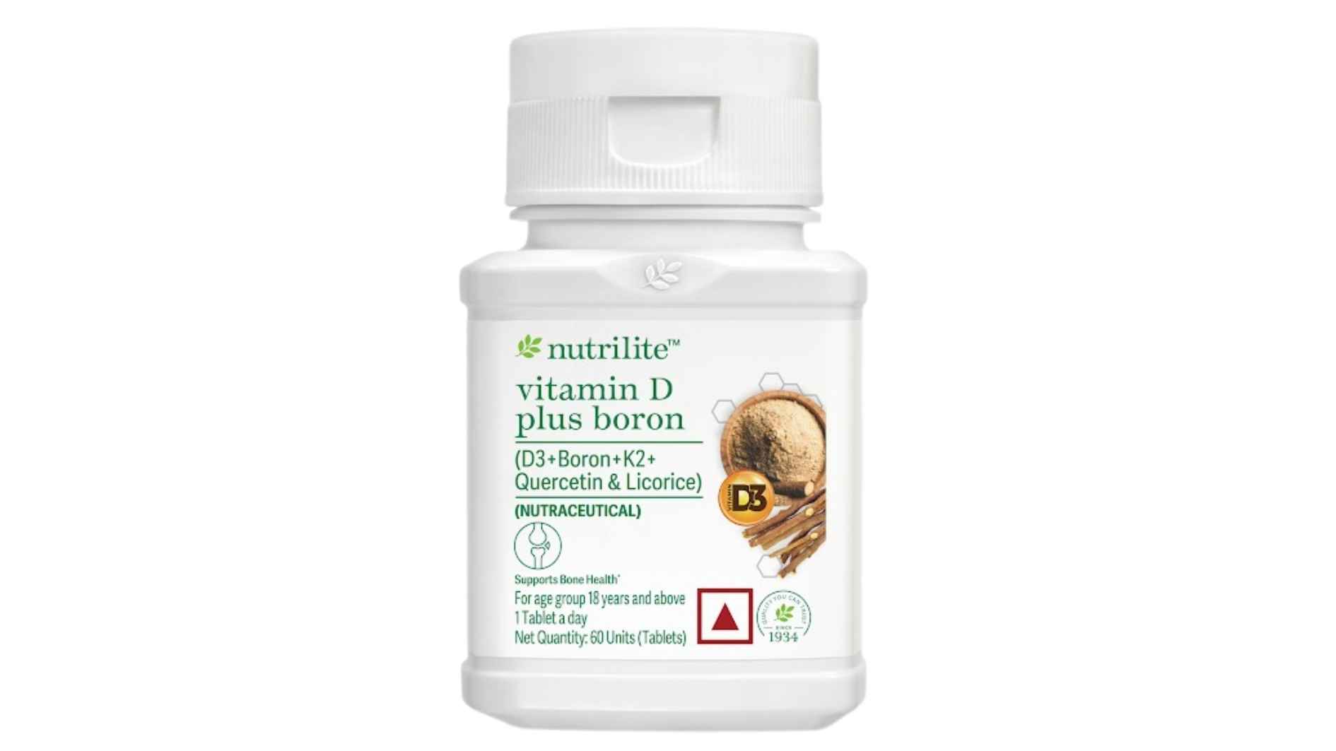 लीकोरिस और क्वेरसेटिन का हमारा पेटेंटेड मिश्रण: न्यूट्रीसर्ट™ फ़ार्म से प्राप्त, जो हड्डियों का समग्र स्वास्थ्य बेहतर करता है और शरीर को प्राकृतिक एंटीऑक्सीडेंट के लाभ पहुँचाता है। न्यूट्रीलाइट विटामिन डी प्लस बोरॉन केवल डिस्ट्रीब्यूटर्स/एमवे बिज़नेस ओनर्स और www.amway.in पर उपलब्ध होगा।